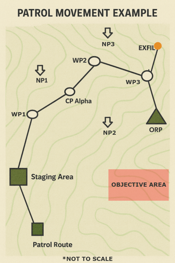 ⚔️ Endstate: The patrol departs organized, navigates through WPs and CPs with discipline, orients on NAVPOINTs, uses ORPs as staging for tasks, maintains constant security, accomplishes its reconnaissance/combat/security mission, and returns intact with mission results.